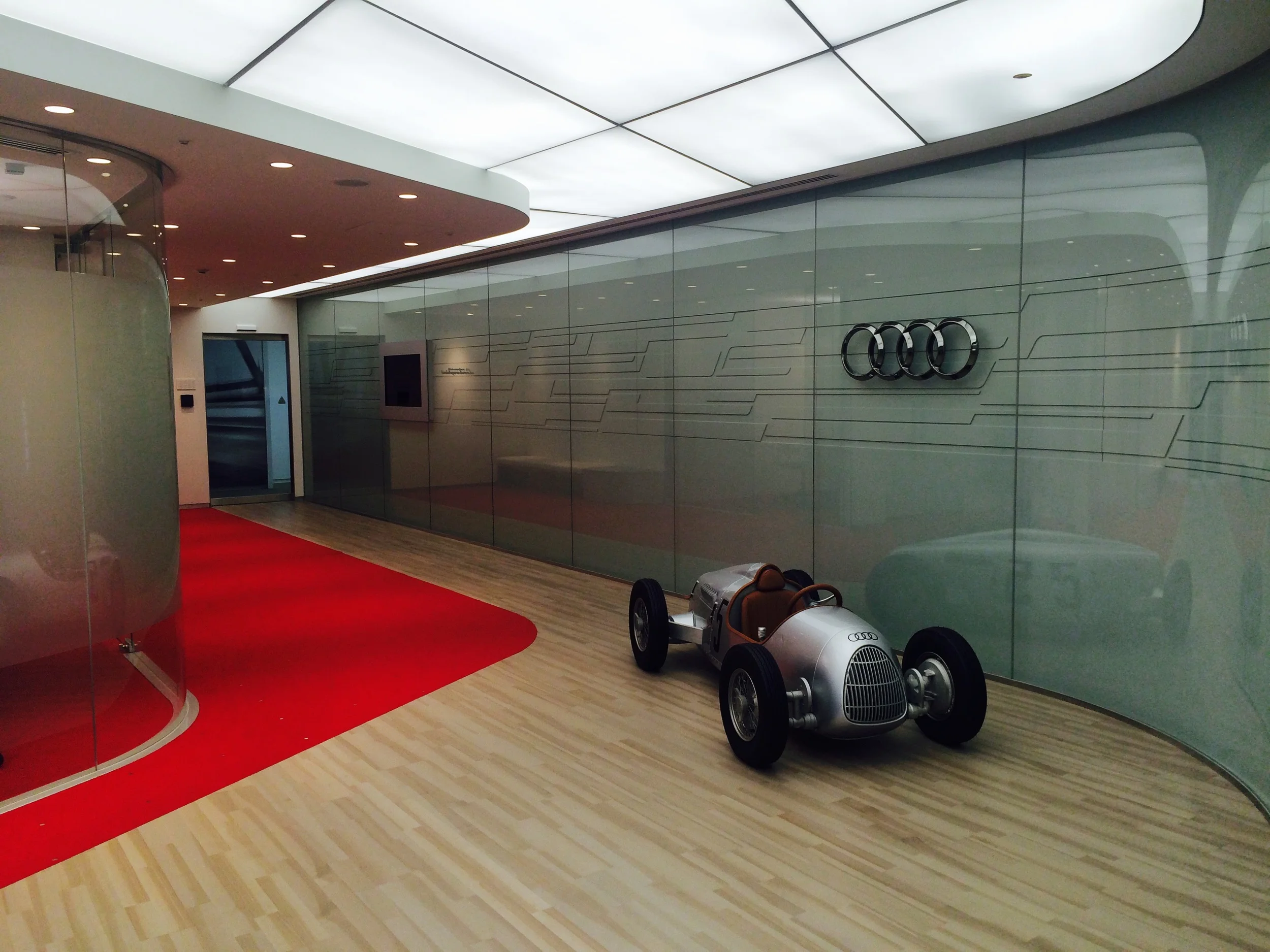 Situated in 16F of Gotenyama Trust Tower Shinagawa, Audi Japan office looked as beautiful as their cars. Four huge elevators brought us directly to the entrance, which is designed with the motif of the race track. There was a vintage model car placed on the floor, perhaps to reinforce this image. A showcase on the reception featured full line of Audi cars.